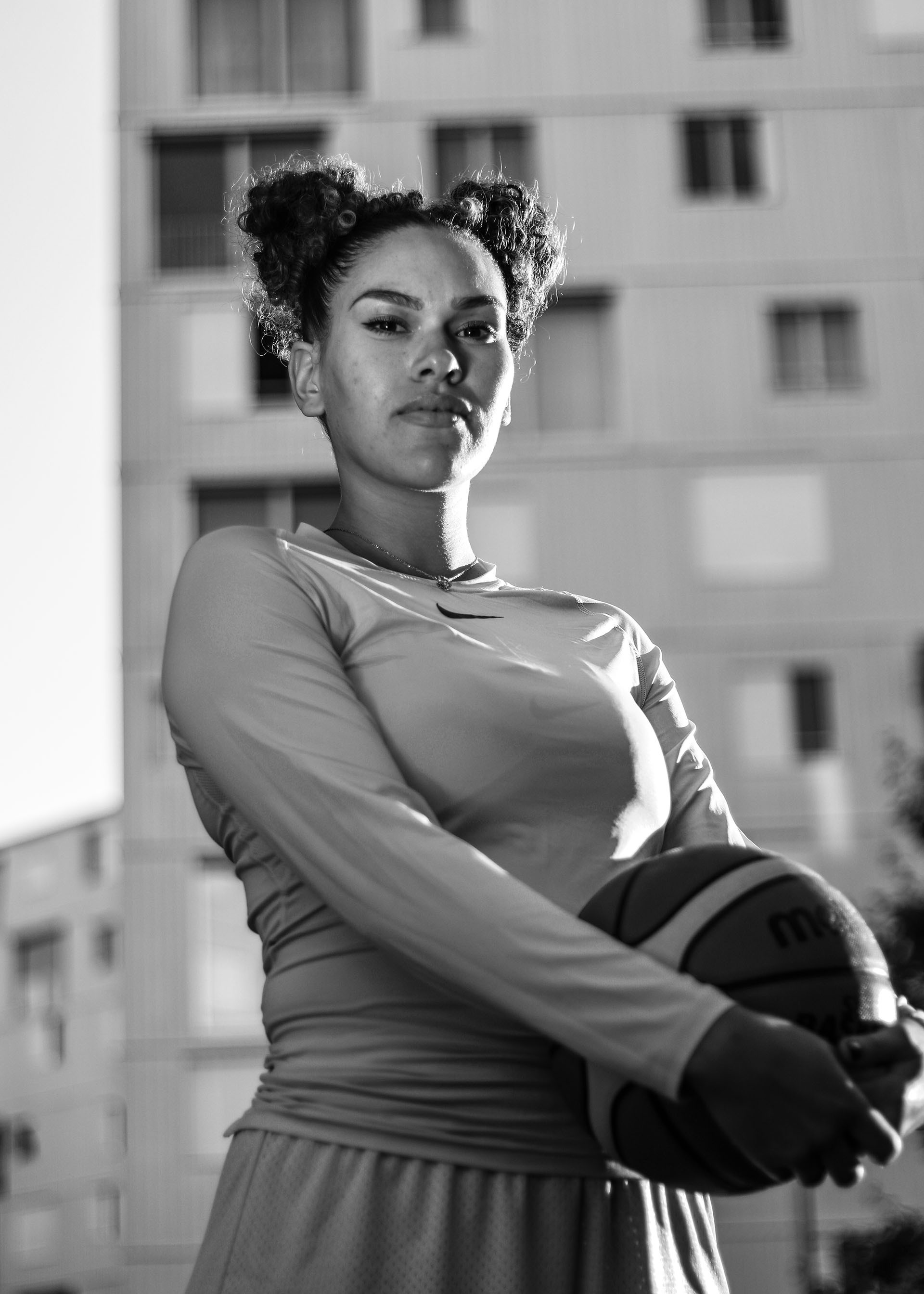 Léa Miranda Monteiro habite à Genève. Elle est avocate stagiaire mais également photographe/ vidéaste. Depuis maintenant plus de 5 ans, elle consacre entièrement son temps libre à la photographie. Son regard est porté en particulier sur les événements et les personnes qui l’entourent. En ce qui concerne son intérêt pour les femmes dans le basketball, elle a été jusqu’à ses 18 ans sportive d’élite et a joué à un haut niveau en Suisse et au Cap vert (pays d’origine). Durant ces années, elle a constaté à quel point ce sport a façonné sa vision de la vie, son rapport aux autres mais également son caractère. En effet, les femmes dans le basketball sont souvent mises de côté et très peu médiatisées. Alors même que ce sport est pour elles essentiel. Les basketteuses vivent et mangent « basket ». Ce sport s’accompagne non seulement de joies mais également de peines, de remises en question, d’interrogations vis-à-vis de sa légitimité dans ce sport… Est-ce simplement un sport ou un lieu d’apprentissage ? Un monde dans lequel nombreux sont les maux, les joies, les peines. Basketball is everything.
